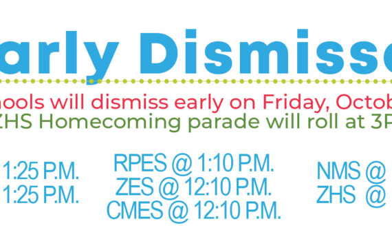 Save the date: Early dismissal on Friday, October 27th.The ZHS Homecoming parade will roll at 3PM. Early Dismissal Times:ZHS @ 11:15 A.M.NMS @ 11:15 A.M.CMES @ 12:10 P.M.ZES @ 12:10 P.M.RPES @ 1:10 P.M.NES @ 1:25 P.M.ZELC @ 1:25 P.M.